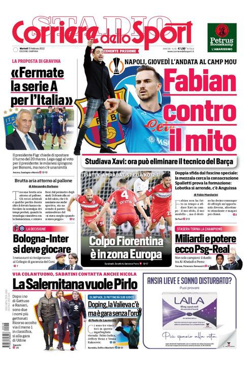 Il Corriere dello Sport, nell'edizione campana, apre con la sfida di Europa League Barcellona-Napoli: "Fabian contro il mito". Studiava Xavi: ora può eliminare il tecnico del Barça.