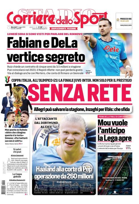 Il Corriere dello Sport, nell'edizione campana, apre con il possibile rinnovo di Fabian Ruiz con il Napoli: "Fabian e DeLa, vertice segreto. Lunedì sera si sono visti per parlare del rinnovo. Ruiz chiede un contratto di cinque anni da 3,5 milioni a stagione. Può svincolarsi nel 2023, il Napoli riflette: non può perderlo gratis. Via al dialogo anche con Mertens, che conta di firmare un biennale".