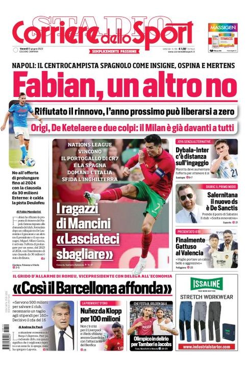 Il Corriere dello Sport, nell'edizione campana, apre con "Fabian, un altro no". Napoli: il centrocampista spagnolo come Insigne, Ospina e Mertens. Rifiutato il rinnovo, l'anno prossimo può liberarsi a zero. No all'offerta di prolungare fino al 2024 con la clausola da 30 milioni. Esterno: è calda la pista Deulofeu.