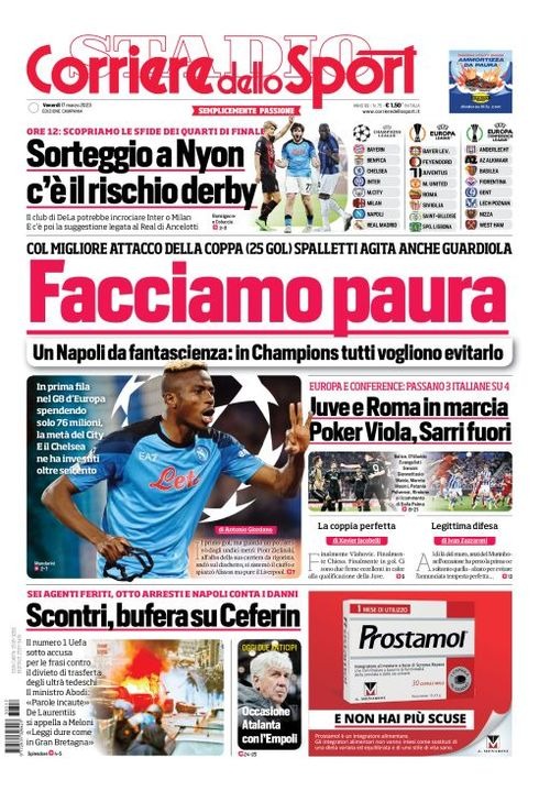 Il Corriere dello Sport, nell'edizione campana, apre con "Facciamo paura". Col migliore attacco della Coppa (25 gol) Spalletti agita anche Guardiola. Un Napoli da fantascienza: in Champions tutti vogliono evitarlo. In prima fila nel G8 d'Europa spendendo solo 76 milioni, la metà del City. E il Chelsea ne ha investiti oltre seicento. In alto, il sorteggio a Nyon: c'è il rischio derby. Ore 12: scopriamo le sfide dei quarti di finale. Il club di DeLa potrebbe incrociare Inter o Milan. E c'è poi la suggestione legata al Real di Ancelotti.