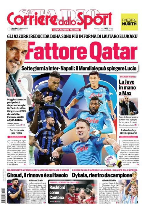 Il Corriere dello Sport, nell'edizione campana, apre parlando della sfida tra Inter e Napoli del 4 gennaio: "Fatto Qatar. Sette giorni a Inter-Napoli: il Mondiale può spingere Lucio. Gli azzurri reduci da Doha sono più in forma di Lautaro e Lukaku. Maggiori certezze per Spalletti rispetto a Inzaghi. Da Zielinski a Kim: il sogno è un 2023 da scudetto. Mercato: assalto a Djalò del Lilla.