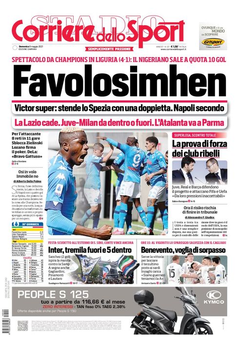 "Favoloshimen", questo è il titolo tributo per Victor Osimhen, attaccante del Napoli, sulla prima pagina del Corriere dello Sport nella sua edizione Campania. "Spettacolo da Champions in Liguria, il nigeriano sale a quota 10 gol. Victor Super: stende lo Spezia con una doppietta. Napoli secondo. Per l'attaccante 8 reti in 11 gare. Sblocca Zielinski. Lozano firma".