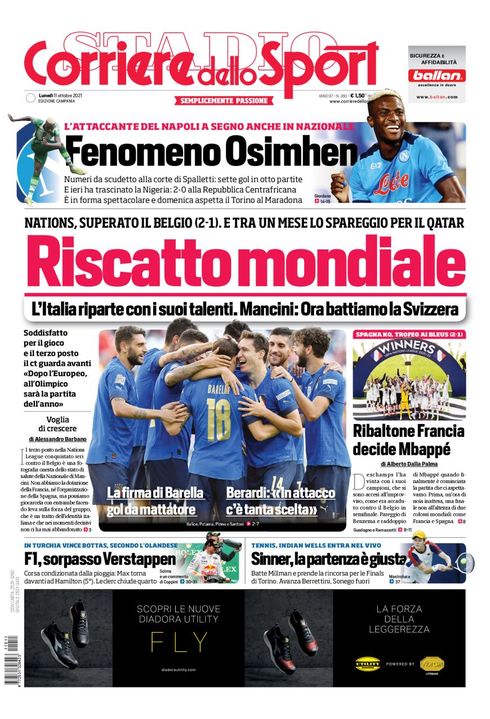 Il Corriere dello Sport, nell'edizione Campania, apre con l'attaccante nigeriano: "Fenomeno Osimhen, l'attaccante del Napoli a segno anche in Nazionale. Numeri da scudetto alla corte di Spalletti: sette gol in otto partite. E ieri ha trascinato la Nigeria: 2-0 alla Repubblica Centroafricana. E' in forma spettacolare e domenica aspetta il Torino al Maradona".