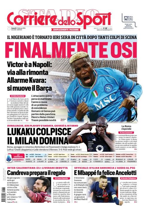 Il Corriere dello Sport, nell'edizione campana, apre con "Finalmente Osi". Il nigeriano è tornato ieri sera in città, dopo tanti colpi di scena. Victor è a Napoli: via alla rimonta. Allarme Kvara: si muove il Barça. L'attaccante aveva perso in mattinata l'aereo a causa di un problema di coincidenze. Domani col Genoa può partire dalla panchina. Meret e Natan titolari. Traorè possibile novità. Spazio anche ai match di Europa League delle italiane "Lukaku colpisce, il Milan domina". In basso, "Candreva prepara il regalo" per Inter-Salernitana. Spazio anche alla notizia del momento, "E Mbappè fa felice Ancelotti", dopo l'annuncio dell'addio del francese al PSG. Infine, la classifica e il calendario della 25esima giornata di Serie A.