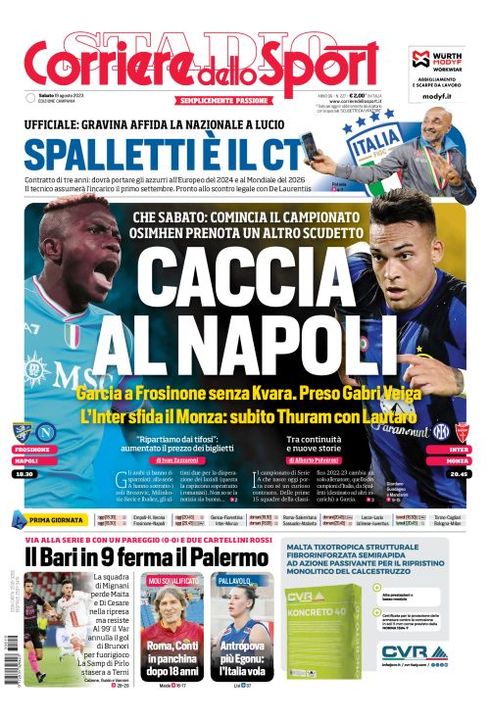 Il Corriere dello Sport, nell'edizione campana, apre parlando dell'inizio del campionato di Serie A e dell'esordio del Napoli a Frosinone: "Caccia al Napoli. Garcia a Frosinone senza Kvara. Preso Gabri Veiga. L'Inter sfida il Monza: subito Thuram con Lautaro. Che sabato: comincia il campionato. Osimhen prenota un altro scudetto". In alto, poi, si parla dell'approdo di Luciano Spalletti sulla panchina dell'Italia.
