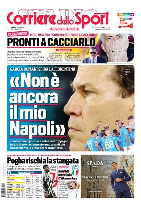 Il Corriere dello Sport, nell'edizione campana, apre con le parole in conferenza stampa dell'allenatore azzurro Rudi Garcia: "Garcia domani sfida la Fiorentina: "Non è ancora il mio Napoli. Concediamo poco, ma subiamo ancora troppi gol. Da Lindstrom mi aspetto qualcosa di più. Ora battiamo la Viola per restare terzi".