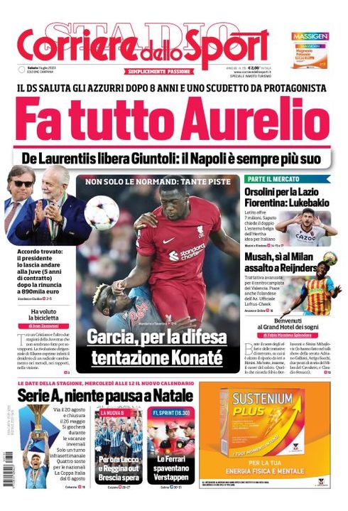 Il Corriere dello Sport, nell'edizione campana, apre con l'addio ufficiale del d.s. Cristiano Giuntoli al Napoli e con le piste di mercato degli azzurri: "Fa tutto Aurelio. Il ds saluta gli azzurri dopo 8 anni e uno scudetto da protagonista. De Laurentiis libera Giuntoli: il Napoli è sempre più suo. Accordo trovato: il presidente lo lascia andare alla Juve (5 anni di contratto) dopo la rinuncia a 890mila euro". In taglio basso: "Garcia, per la difesa tentazione Konatè. Non solo Le Normand: tante piste".