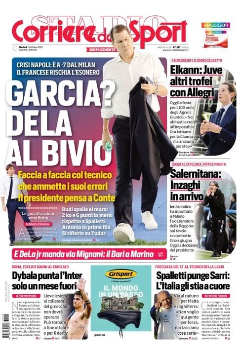 Il Corriere dello Sport, nell'edizione campana, apre con "Garcia? DeLa al bivio". Crisi Napoli: è a -7 dal Milan. Il francese rischia l'esonero. Faccia a faccia col tecnico che ammette i suoi errori. Il presidente pensa a Conte. Rudi spalle al muro: 2 ko e 6 punti in meno rispetto a Spalletti. Antonio in prima fila. Si riflette su Tudor. e DeLa jr manda via Mignani: il Bari a Marino. Spazio all'intervista a John Elkann: "Juve, altri trofei con Allegri". Salernitana, Inzaghi in arrivo. In basso, Dybala punta l'Inter: solo un mese fuori. Spalletti punge Sarri: "L'Italia gli stia a cuore". Via al raduno per Malta e Inghilterra. "Non voglio qui gente per forza, noi facciamo cose serie".