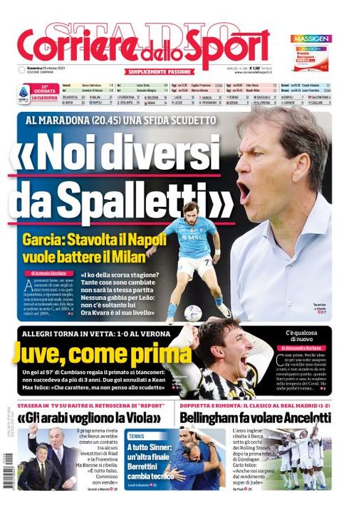 Il Corriere dello Sport, nell'edizione campana, apre con le dichiarazioni di Rudi Garcia alla vigilia del match contro il Milan al Maradona (20:45) una sfida Scudetto: "Noi diversi da Spalletti! Stavolta il Napoli vuole battere il Milan. I ko della scorsa stagione? Tante cose sono cambiate, non sarà la stessa partita. Nessuna gabbia per Leao: non c'è soltanto lui. Ora Kvara è al suo livello". Spazio anche alla vittoria dei bianconeri "Juve, come prima". In basso, il retroscena di Report "Gli arabi vogliono la Viola". Il tennis, con "A tutto Sinner: un'altra finale. Berrettini cambia tecnico". Spazio anche al successo nel Clasico contro il Barcellona per il Real Madrid, con la doppietta di Jude Bellingham che "fa volare Ancelotti".