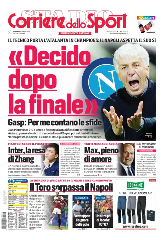 Il Corriere dello Sport, nell'edizione campana, apre con le parole di Gasperini: "Decido dopo la finale. Per me contano le sfide". Il tecnico porta l'Atalanta in Champions: il Napoli aspetta il suo si. Gian Piero vince 2-0 a Lecce e festeggia la qualificazione aritmetica: "Adesso penso al match di mercoledì con il Bayer, poi valuterò il futuro".Manna presto in azione. E il club di De Laurentiis può ancora andare in Conference. Spazio anche all'Inter "la resa di Zhang" e ad Allegri "Max, pieno d'amore". In basso, il Torino vince contro il Milan e sorpassa il Napoli in classifica. Infine, i match della 37esima giornata della domenica con la classifica, la Formula 1 e l'atletica.