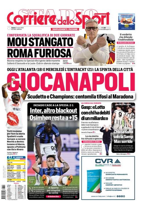 Il Corriere dello Sport, nell'edizione campana, apre con la gara del Napoli contro l'Atalanta che potrebbe valere il nuovo +18 sull'Inter dopo la sconfitta dei nerazzurri sul campo dello Spezia: "GiocaNapoli. Oggi l'Atalanta (18) e mercoledì l'Eintracht (21): la spinta della città. Scudetto e Champions: centomila tifosi al Maradona. Tutti insieme per fare la storia. Spalletti vuole tornare a correre. Novità a destra: Lozano si blocca, spazio a Politano con Osi e Kvara".