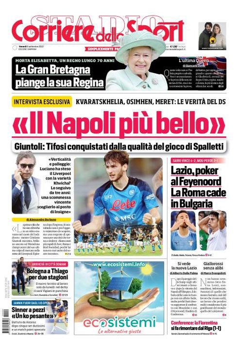 Il Corriere dello Sport, nell'edizione campana, apre con l'intervista esclusiva a Cristiano Giuntoli: "Il Napoli più bello. Tifosi conquistati dalla qualità del gioco di Spalletti". Kvaratskhelia, Osimhen, Meret: le verità del ds. "Verticalità e palleggio: Luciano ha steso il Liverpool con la varietà. Khvicha? Lo seguivo da tre anni: una scommessa vincente sceglierlo al posto di Insigne".