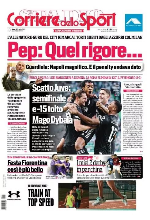 Il Corriere dello Sport apre "Pep: "Quel rigore...". L'allenatore-guru del City rimarca i torti subiti dagli azzurri col Milan. Guardiola: "Napoli magnifico. E il penalty andava dato". La certezza dello spagnolo: "La squadra di Spalletti riproverà a vincere la Champions". Mercato: piace Thiago Almada.