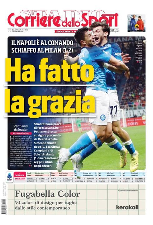 Il Corriere dello Sport, edizione Campania, dedica spazio alla vittoria del Napoli contro il Milan: "Ha fatto la grazia. Il Napoli è al comando, schiaffo al Milan (1-2). Straordinaria prova di forza a San Siro. Politano sblocca su rigore procurato da Kvaratskhelia, Simeone chiude dopo l'1-1 di Giroud. Campioni a -3, solo l'Atalanta (1-0 in casa Roma) regge il ritmo degli azzurri".