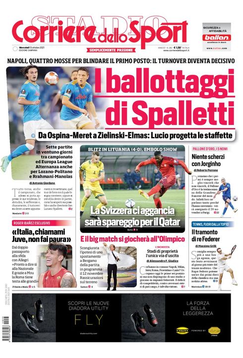 "I ballottaggi di Spalletti", apre così in prima pagina il Corriere dello Sport, nella sua edizione Campania di oggi. "Quattro mosse per blindare il primo posto: il turnover diventa decisivo. Da Ospina-Meret a Zielinski-Elmas: Lucio progetta le staffette. Sette partite in ventuno giorni tra campionato ed Europa League. Alternanza anche per Politano-Lozano e Rrahmani-Manolas".