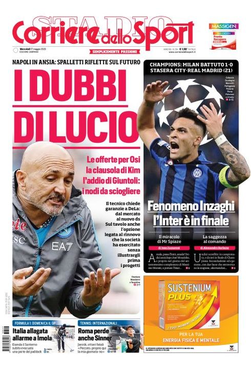 Il Corriere dello Sport, nell'edizione campana, apre parlando dell'allenatore azzurro Luciano Spalletti e del suo possibile futuro: "I dubbi di Lucio. Napoli in ansia: Spalletti riflette sul suo futuro. Le offerte per Osi, la clausola di Kim e l'addio di Giuntoli: i nodi da sciogliere. Il tecnico chiede garanzie a DeLa: dal mercato al nuovo ds. Sul tavolo anche l'opzione legata al rinnovo che la società ha esercitato senza illustrargli prima i progetti".