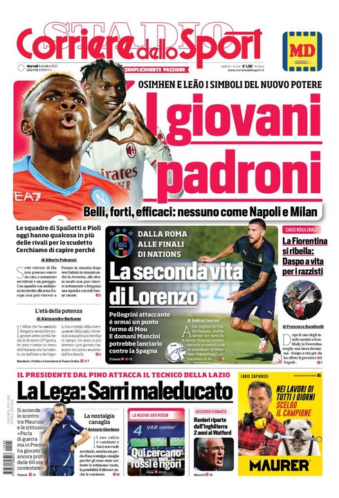 Il Corriere dello Sport, nell'edizione Campania, si sofferma su Osimhen e Leao, i simboli del nuovo potere: "I giovani padroni. Belli,forti, efficaci. Nessuno come Napoli e Milan". Le squadre di Spalletti e Pioli oggi hanno qualcosa in più delle rivali per lo scudetto.