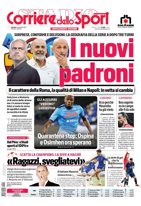 Il Corriere dello Sport, nella sua edizione Campania, apre con le tre squadre in vetta alla classifica: "I nuovi padroni. Il carattere della Roma, la qualità di Milan e Napoli: in vetta si cambia. Solo Juve e Atalanta al di sotto delle attese, ma c'è ancora tempo. Inter e Lazio in cerca di equilibri stabili. La novità è la Viola". Spazio anche alla sfida con il Leicester: "Quarantena stop. Ospina e Osimhen ora sperano".