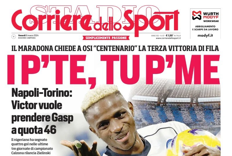 Il Corriere dello Sport, nell'edizione campana, apre con "I p' te, tu p' me". Il Maradona chiede a Osi "centenario" la terza vittoria di fila. Napoli-Torino: Victor vuole prendere Gasp a quota 46. Il nigeriano ha segnayo quattro gol nelle ultime tre giornate di campionato. Calzona rilancia Zielinski. Il tris di successi manca da gennaio del 2023. Si gioca alle 20:45. De Laurentiis annuncia: "Faccio lo stadio a Bagnoli". Spazio anche alle vittorie di Roma, Milan e Fiorentina in Europa. In basso, "Salernitana, torna Fazio", "Gravina: "Arbitri, noi sotto tiro". Infine, la Formula 1, il rugby e il programma e la classifica della 28esima giornata di Serie A.