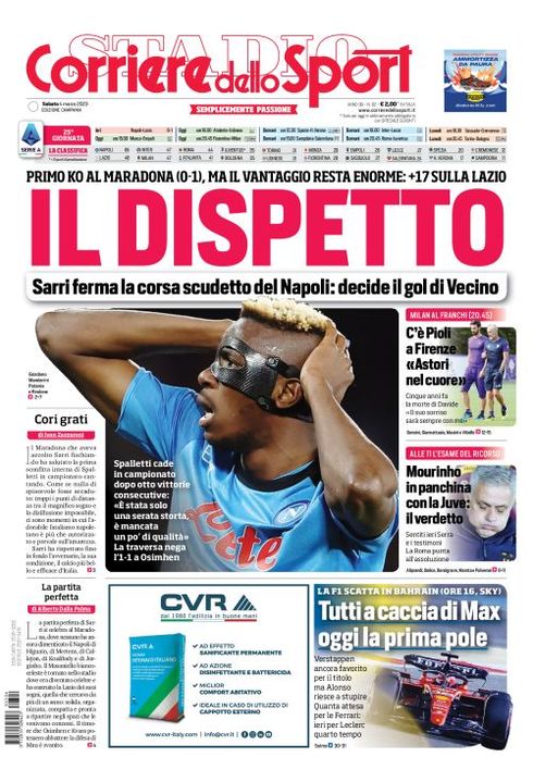 Il Corriere dello Sport, nell'edizione campana, apre con la sconfitta del Napoli al Maradona contro la lazio dell'ex Sarri: "Il dispetto. Sarri ferma la corsa scudetto del Napoli: decide il gol di Vecino. Primo ko al Maradona (0-1), ma il vantaggio resta enorme: +17 sulla Lazio".