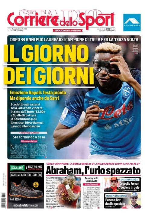 Il Corriere dello Sport, nell'edizione campana, apre con "Il giorno dei giorni". Dopo 33 anni può laurearsi Campione d'Italia per la terza volta. Emozione Napoli: festa pronta ma dipende da Sarri. Scudetto agli azzurri se la Lazio non vincerà in casa dell'Inter (12:30) e Spalletti batterà la Salernitana (15). Il tecnico: "Divertiamoci usando il buonsenso". Sta tornando a casa...