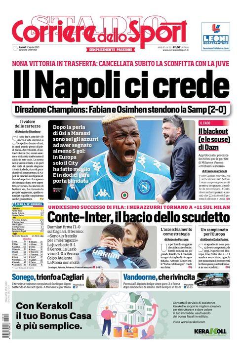 Il Corriere dello Sport nella sua edizione Campania apre con la vittoria del Napoli in campionato sulla Sampdoria: "Il Napoli ci crede. Direzione Champions: Fabian e Osimhen stendono la Samp (2-0). Sono sei gli azzurri ad aver segnato almeno 5 gol. E in dodici gare porta blindata". Di seguito la prima pagina: