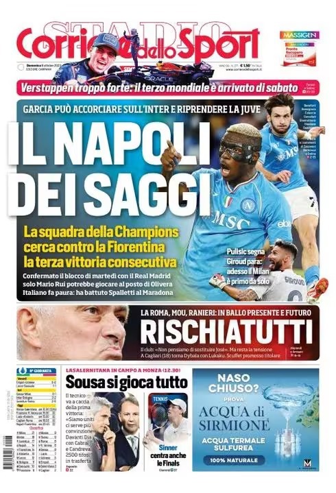 Il Corriere dello Sport, nell'edizione campana, apre con "Il Napoli dei saggi". Garcia può accorciare sull'Inter e riprendere la Juve. La squadra della Champions cerca contro la Fiorentina la terza vittoria consecutiva. Confermato il blocco di martedì con il Real Madrid, solo Mario Rui potrebbe giocare al posto di Mario Rui. Italiano fa paura: ha battuto Spalletti al Maradona. E, ancora, la vittoria dei rossoneri contro il Genoa "Pulisic segna, Giroud para: adesso il Milan è primo da solo". In alto, spazio alla Formula 1 con "Verstappen troppo forte: il terzo mondiale è arrivato di sabato". In basso, la Roma, Mou, Ranieri: in ballo presente e futuro "Rischiatutti". Poi, la Salernitana con "Sousa si gioca tutto" e il tennis con "Sinner centra anche le Finals".