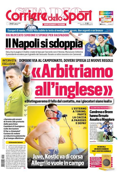 Il Corriere dello Sport, nell'edizione campana, apre con "Il Napoli si sdoppia". Ha bloccato Simeone e spinge per Raspadori. DeLa ha in pugno il Cholito: create le basi per l'accordo con il Verona. Ma la Juve s'informa. Il presidente accelera per il gioiello del Sassuolo: fissato un altro incontro con Carnevali.