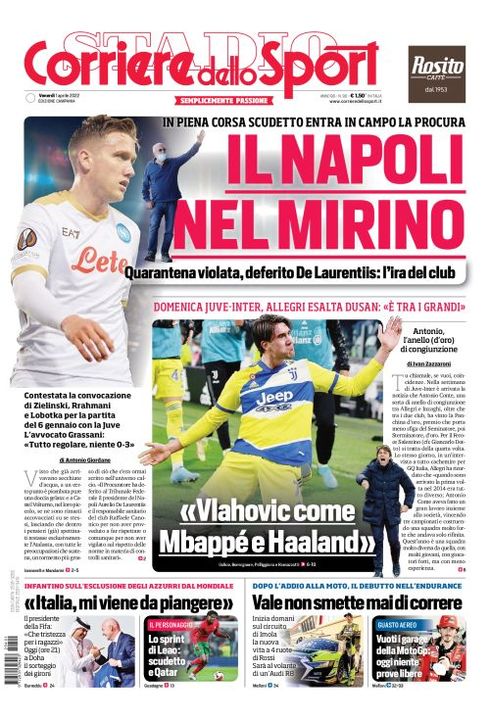 Il Corriere dello Sport, nell'edizione campana, apre con "Il Napoli nel mirino". In piena corsa scudetto, entra in campo la Procura. Quarantena violata, deferito De Laurentiis: l'ira del club. Contestata la convocazione di Zielinski, Rrahmani e Lobotka per la partita del 6 gennaio con la Juve. L'avvocato Grassani: "Tutto regolare, niente 0-3".