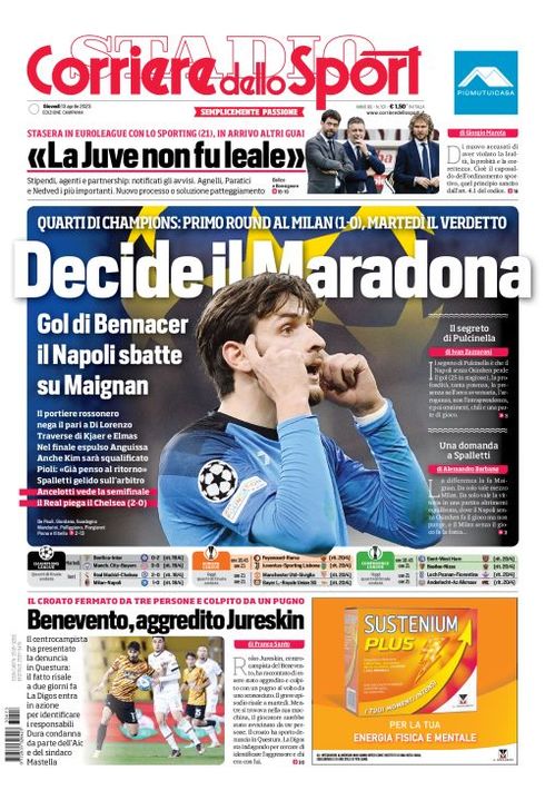 Il Corriere dello Sport, edizione Campania, ha dedicato spazio in prima pagina all'andata dei quarti di Champions League: "Decide il Maradona. Quarti di Champions: Primo round al Milan (1-0) martedì il verdetto. Gol di Bennacer, il Napoli sbatte su Maignan".