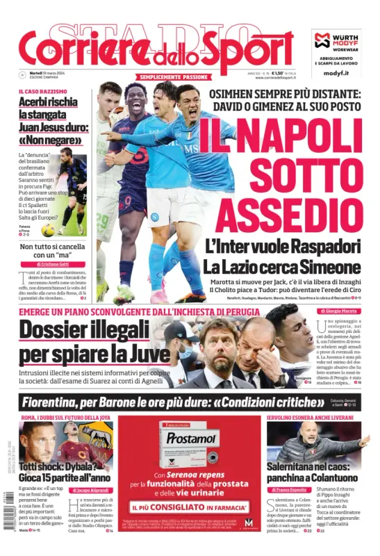 Il Corriere dello Sport, nell'edizione campana, apre con "Il Napoli sotto assedio". Osimhen sempre più distante: David o Gimenez al suo posto. L'Inter vuole Raspadoria, la Lazio cerca Simeone. Marotta si muove per Jack, c'è il via libera di Inzaghi. Il Cholito piace a Tudor: può diventare l'erede di Ciro. Spazio anche all'episodio che riguarda Acerbi e Juan Jesus "Acerbi rischia la stangata. Juan Jesus duro: "Non negare". La "denuncia" del brasiliano confermata dall'arbitro. Saranno sentiti in procura FIGC. Può arrivare uno stop di dieci giornate. Il c.t. Spalletti lo lascia fuori. Salta gli Europei? Poi la Juventus, con "Dossier illegali per spiare la Juve". Emerge un piano sconvolgente dall'inchiesta di Perugia. Intrusioni illecite nei sistemi informativi per colpire la società: dall'esame di Suarez ai conti di Agnelli. Momenti di apprensione in casa Fiorentina "Per Barone le ore più dure: "Condizioni critiche". In basso, Totti shock: "Dybala? Gioca 15 partite all'anno. E' un top, ma se fossi dirigente penserei bene a cosa fare. E' uno dei più importanti, però va in campo solo in un terzo delle gare". Infine, Salernitana nel caos: panchina a Colantuono. Iervolino esonera anche Liverani. Sfumano il ritorno di Pippo Inzaghi e anche l'arrivo di un nuovo direttore sportivo. Tocca al coordinatore del settore giovanile: oggi l'ufficialità.