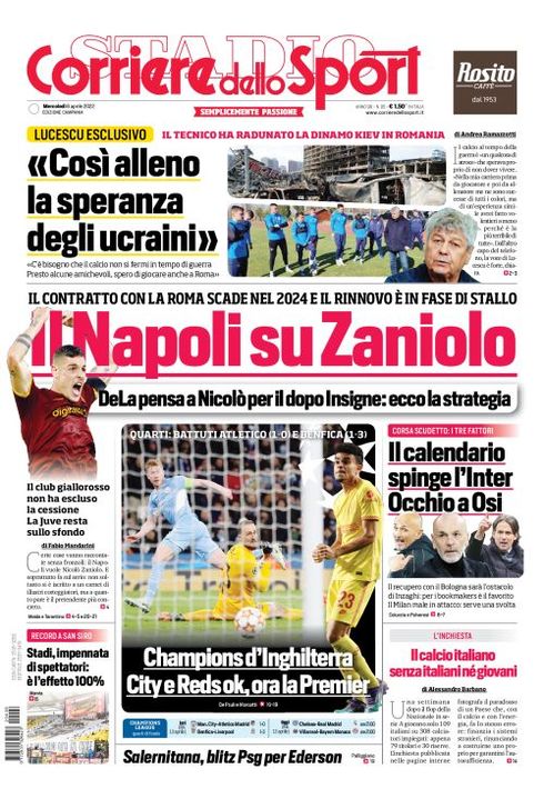 Il Corriere dello Sport, nell'edizione campana, apre con l'interesse del Napoli per l'esterno della Roma Nicolò Zaniolo in vista della prossima stagione: "Il Napoli su Zaniolo. Il contratto con la Roma scade nel 2024 e il rinnovo è in fase di stallo. DeLa pensa a Nicolò per il dopo Insigne: ecco la strategia".