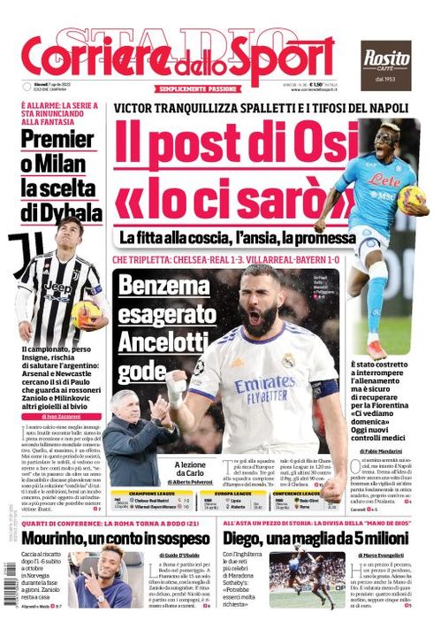 Il Corriere dello Sport, edizione Campania, ha dedicato spazio in prima pagina al Napoli e a VIctor Osimhen: "Il posti di Osi: "Io ci saò". La fitta alla coscia, l'ansia, la promessa. Victor tranquillizza Spalletti e i tifosi del Napoli". C'è spazio anche per la Champions League. "Benzema esagerato, Ancelotti gode. Che tripletta: Chelsea-Real 1-3. Villarreal-Bayern 1-0".