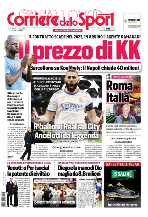 Il Corriere dello Sport, edizione Campania di oggi, dedica spazio in prima pagina al Napoli e al futuro di Kalidou Koulibaly: "Il prezzo di KK. Barcellona su Koulibaly: il Napoli chiede 40 milioni. In arrivo l'agente Ramadani". Di spalla ancora spazio al mercato in casa Napoli: "Atteso anche il manager di Rrahmani per il rinnovo. Centrocampo: Giuntoli tratta Svanberg".