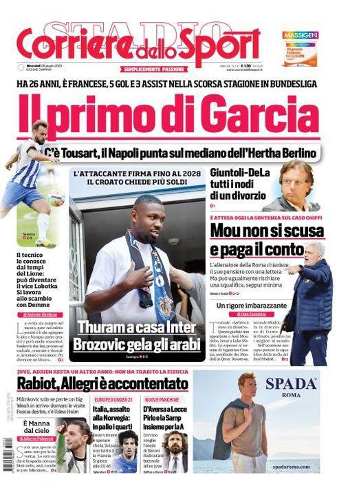 Il Corriere dello Sport, nell'edizione campana, apre con il possibile scambio Demme-Tousart tra Napoli ed Hertha Berlino: "Il primo di Garcia. C'è Tousart, il Napoli punta sul mediano dell'Hertha Berlino. Ha 26 anni, è francese, 5 gol e 3 assist nella scorsa stagione in Bundesliga. Il tecnico lo conosce dai tempi del Lione: può diventare il vice Lobotka. Si lavora allo scambio con Demme".