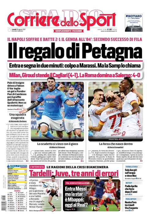 Il Corriere dello Sport, nella sua edizione Campania, apre in prima pagina con la vittoria del Napoli a Genova: "Il regalo di Petagna. Entra e segna in due minuti: colpo a Marassi. Ma la Samp lo chiama. Spalletti: 'Non so se resterà qu'". In taglio basso l'intervista all'ex bianconero Marco Tardelli: "Juve, tre anni di errori". Più in basso spazio all'esordio col Psg di Messi: "Entra Messi ma la star é Mbappé: oggi al Real?".