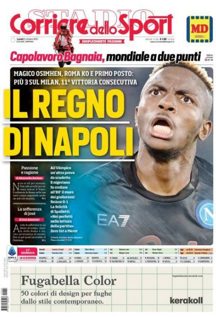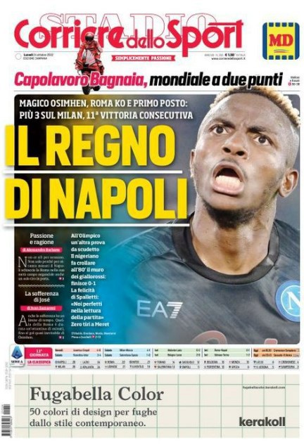 Il Corriere dello Sport, edizione Campania, dedica spazio alla vittoria del Napoli contro la Roma: "Il regno di Napoli. Magico Osimhen, Roma ko e primo posto: più 3 sul Milan, 11^ vittoria consecutiva".