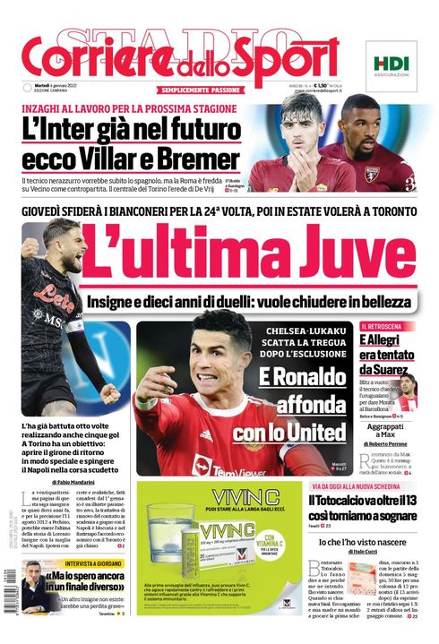 Il Corriere dello Sport, nell'edizione campana, apre con quello che potrebbe essere l'ultimo Juve-Napoli per il capitano azzurro: "L'ultima Juve. Insigne e dieci anni di duelli, vuole chiudere in bellezza".