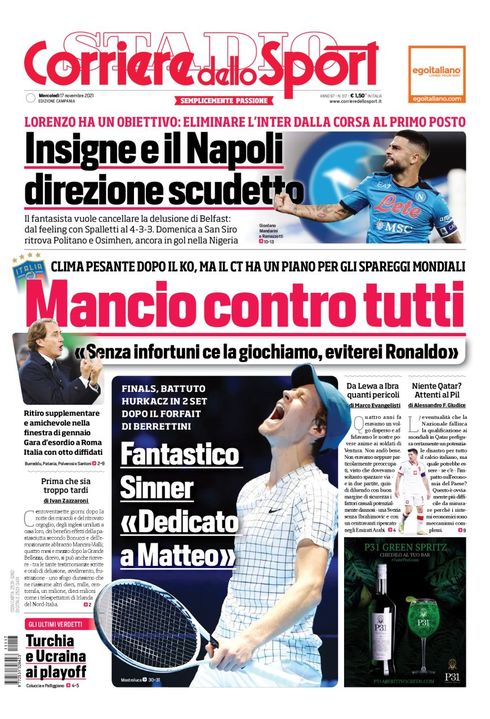 Il Corriere dello Sport, nell'edizione campana, apre con la lotta scudetto in Serie A e l'imminente Inter-Napoli: "Insigne e il Napoli, direzione scudetto. Lorenzo ha un obiettivo: eliminare l'Inter dalla corsa al primo posto. Il fantasista vuole cancellare la delusione di Belfast: dal feeling con Spalletti al 4-3-3. Domenica a San Siro ritrova Politano e Osimhen, ancora in gol nella Nigeria".
