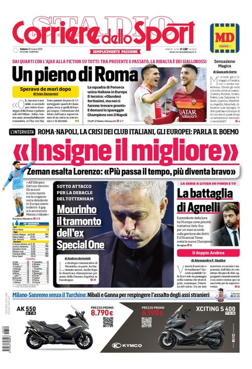 "Insigne, il migliore", questo è il titolo di apertura della prima pagina del quotidiano Il Corriere dello Sport, edizione Campania, oggi in edicola. Zeman esalta Lorenzo: "Più passa il tempo, più diventa bravo". Roma-Napoli, la crisi dei club italiani gli europei: parla il boemo. Intervista a Zeman.