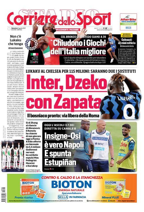 "Insigne-Osi, è vero Napoli. E spunta Estupinan", titola così in prima il Corriere dello Sport nell'edizione Campania di oggi. "Oggi l'Ascoli (17.30). Diretta su Canale 8". In taglio alto spazio alle Olimpiadi di Tokyo 2020, che si chiudono oggi: "Chiudono i Giochi dell'Italia migliore".
