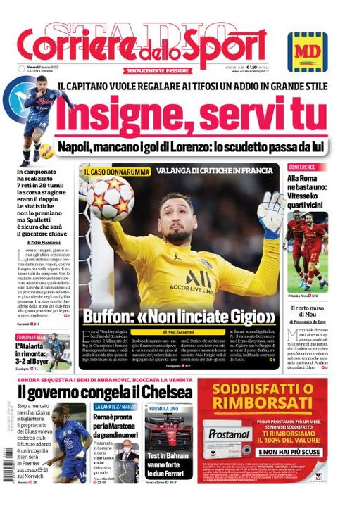 Il Corriere dello Sport, nell'edizione campana, apre con con "Insigne, servi tu". Il capitano vuole regalare ai tifosi un addio in grande stile. Napoli, mancano i gol di Lorenzo: lo scudetto passa da lui.
