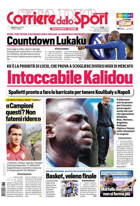 Il Corriere dello Sport, nell'edizione campana, apre parlando del difensore azzurro Kalidou Koulibaly: "Intoccabile Kalidou. Spalletti pronto a fare le barricate per tenere Koulibaly al Napoli. KK è la priorità di Lucio, che prova a sciogliere diversi nodi di mercato. Il difensore non ha prezzo per il tecnico, preoccupato anche dai casi che riguardano Osimhen, Ruiz, Mertens, Anguissa, Politano, Ospina e Ounas: tutte situazioni in sospeso".