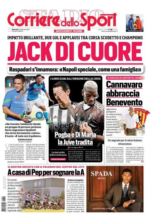 Il Corriere dello Sport, nell'edizione campana, apre con le parole pronunciate dal ritiro dell'Italia dall'attaccante azzurro Giacomo Raspadori: "Jack di cuore. Raspadori s'innamora: "Napoli speciale, come una famiglia". Impatto brillante, due gol e applausi tra corsa scudetto e Champions. "Ho trovato l'ambiente ideale: un gruppo di persone perbene. Devo ringraziare Spalletti che mi ha fortemente voluto". E Lucio: "E' nato con il pallone".