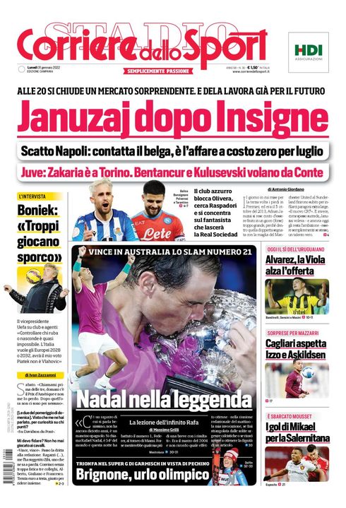 Il Corriere dello Sport, edizione Campania, ha dedicato la prima pagina al mercato del Napoli: "Januzaj dopo Insigne. Alle 20 si chiude un mercato sorprendente e DeLa lavora già per il futuro. Scatto Napoli: contatta il belga, è l'affare a costo zero per luglio". C'è spazio anche per la Juventus: "Juve: Zakaria è a Torino. Bentancur e Kulusevski volano da Conte" e per la vittoria di Nadal all'Australian Open: "Nadal nella leggenda. Vince in Australia lo slam numero 21".