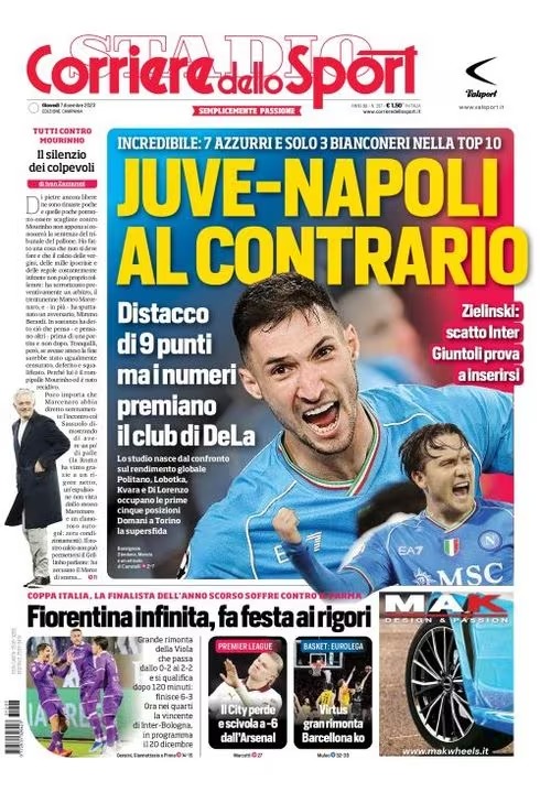 Il Corriere dello Sport, nell'edizione campana, apre con "Juve-Napoli al contrario". Incredibile: 7 azzurri e solo 3 bianconeri nella top 10. Distacco di 9 punti, ma i numeri premiano il club di De Laurentiis. Lo studio nasce dal confronto sul rendimento globale: Politano, Lobotka, Kvara e Di Lorenzo occupano le prime cinque posizioni. Domani a Torino la supersfida. Zielinski: scatto Inter, Giuntoli prova a inserirsi. In basso, "Fiorentina infinita, fa festa ai rigori", "Premier League: il City perde e scivola a -6 dall'Arsenal", "Basket, Eurolega: Virtus gran rimonta, Barcellona ko".