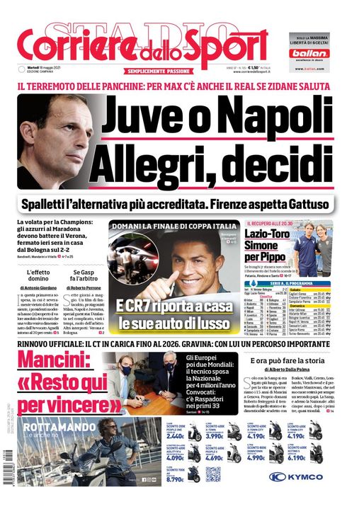 "Juve o Napoli Allegri, decidi", titola così la prima pagina del quotidiano Il Corriere dello Sport nella sua edizione Campania. "Spalletti l'alternativa più accreditata. Firenze aspetta Gattuso. La volata per la Champions: gli azzurri al Maradona devono battere il Verona, fermato ieri sera in casa dal Bologna sul 2-2"