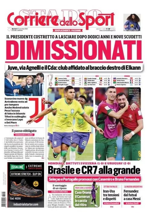 Il Corriere dello Sport, nell'edizione campana, apre con "Dimissionati". Juve, via Agnelli e il Cda: club affidato al braccio destro di Elkann. Il presidente costretto a lasciare dopo dodici anni e nove scudetti. Scanavino nuovo dg. Arrivabene resta ad pro tempore. Anche nedved saluta. Pesa l'accusa di falso in bilancio. Tifosi in subbuglio: s'invocano Lapo e Del Piero.