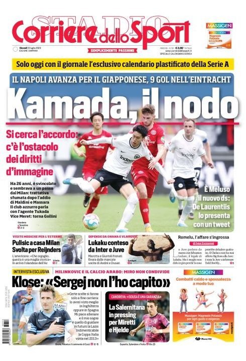 Il Corriere dello Sport, nell'edizione campana, apre con "Kamada, il nodo". Il Napoli avanza per il giapponese, 9 gol nell'Eintracht. Si cerca l'accordo: c'è l'ostacolo dei diritti d'immagine. Ha 26 anni, è svincolato e sembrava a un passo dal Milan: trattativa sfumata dopo l'addio di Maldini e Massara. Il club azzurro parla con l'agente Tukada. Vice Meret: torna Gollini. E' Meluso il nuovo direttore sportivo: De Laurentiis lo presenta con un tweet.