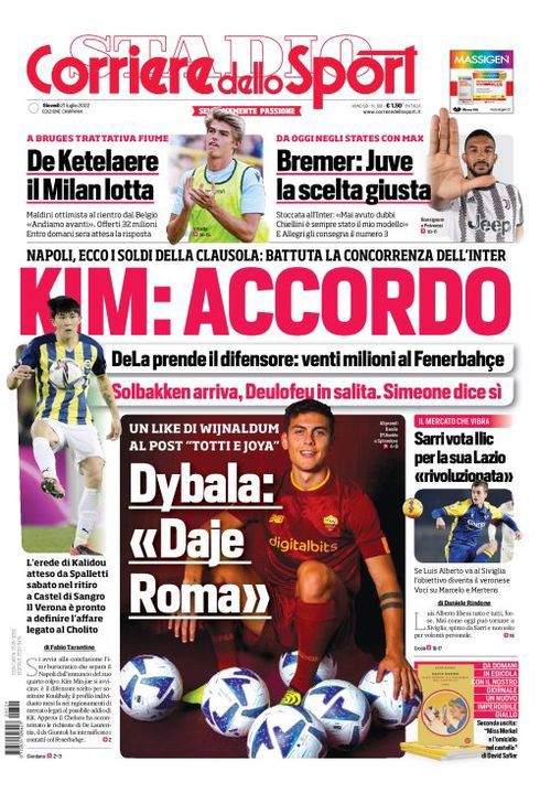 Il Corriere dello Sport, edizione Campania, dedica spazio in prima pagina al calciomercato del Napoli: "Kim: accordo. Napoli, ecco i soldi della clausola: battuta la concorrenza dell'Inter. DeLa prende il difensore: venti milioni al Fenerbahce. Solbakken arriva, Delufelu in salita. Simeone dice sì". C'è spazio anche per Bremer alla Juventus: "Bremer: Juve la scelta giusta", e per Dybala alla Roma: "Dybala: "Daje Roma".
